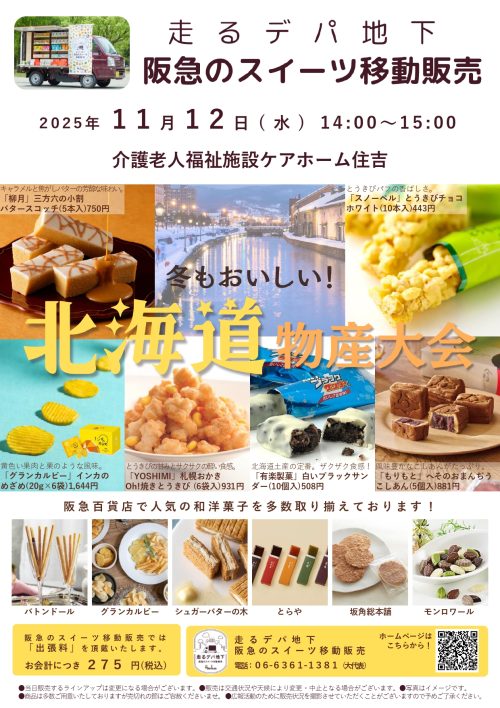 ご好評いただいております、阪急百貨店の移動販売車でのスイーツ販売【走るデパ地下】を11/12(水)に開催する事になりましたのでご案内いたします。