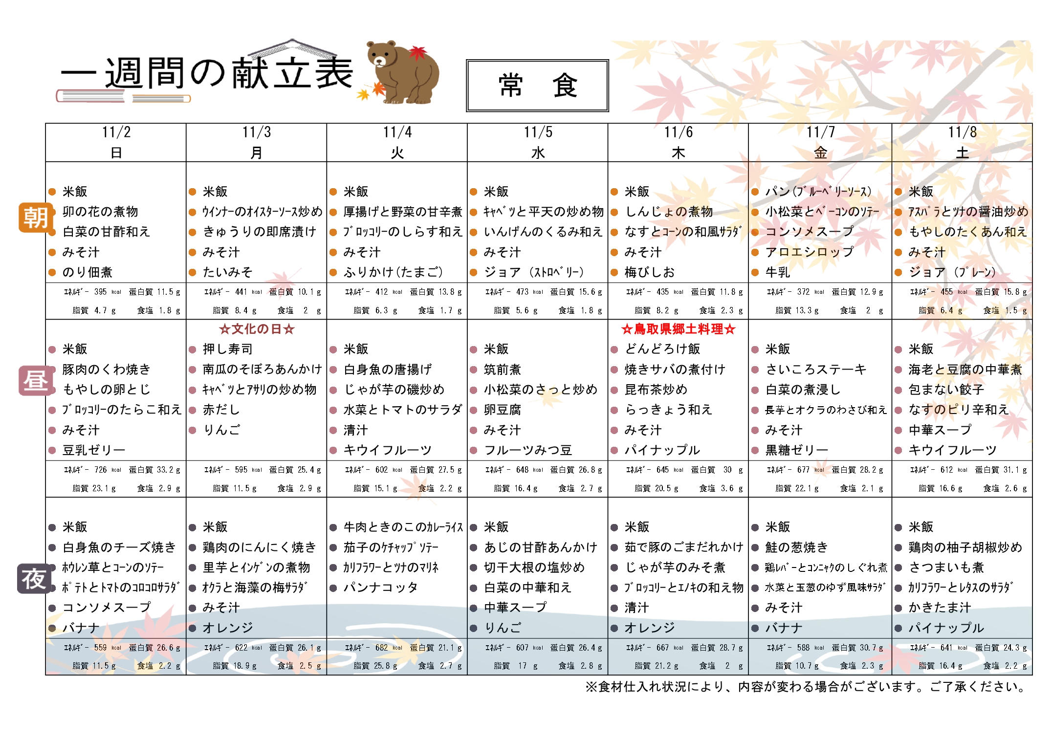◇今週の献立 (11/2~11/8) ◇